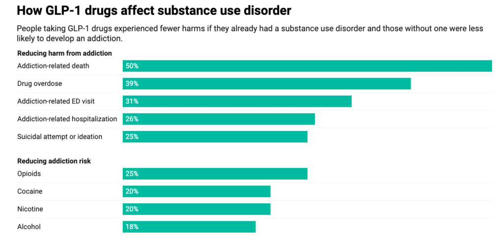 Reductions of this magnitude are rare in addiction medicine – and what’s remarkable is that the finding came from drugs initially designed for diabetes, later repurposed for obesity and never intended to treat addiction.
